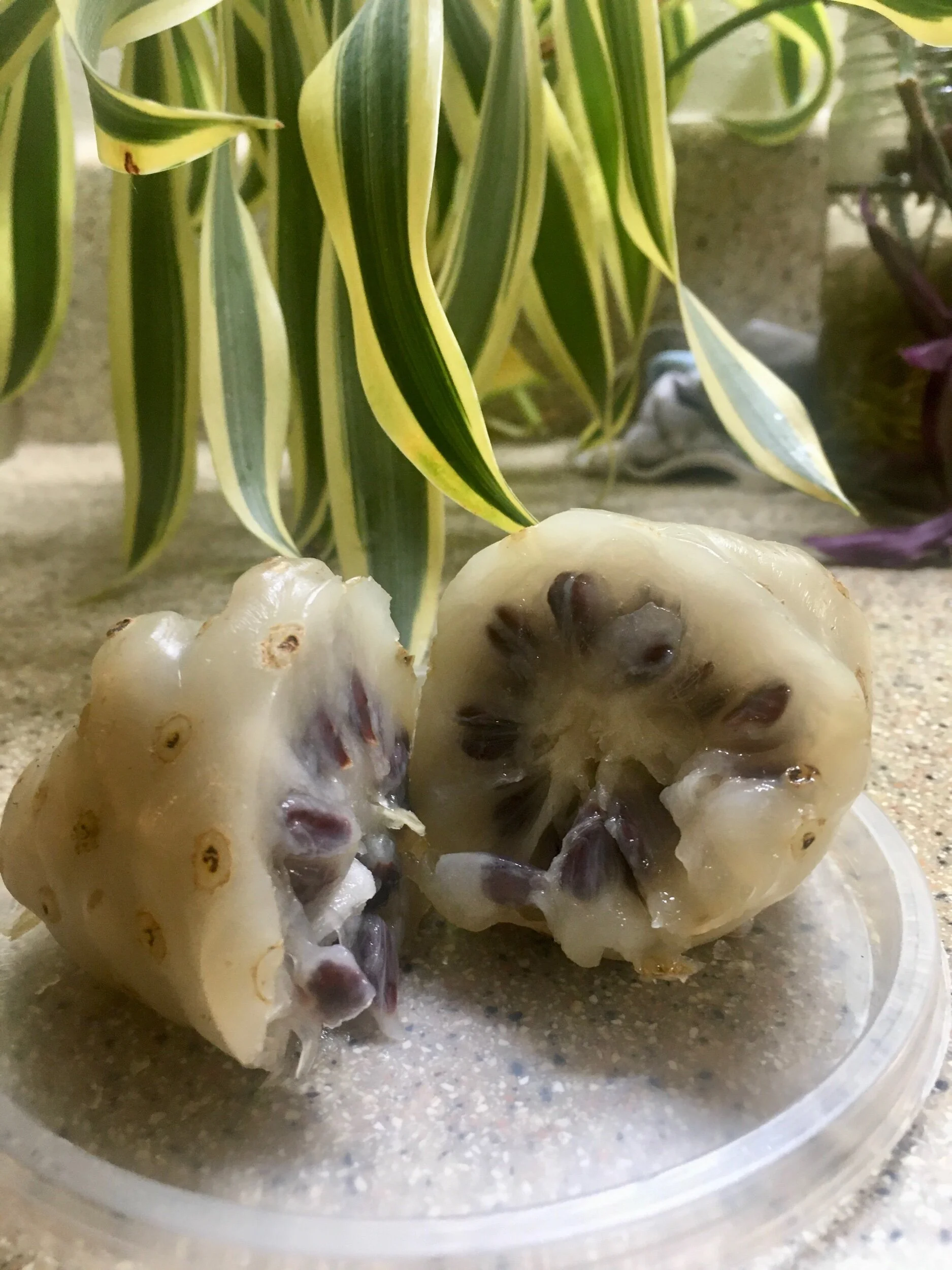 Walking along some of St. John’s most popular beaches like Maho Bay and Trunk Bay, you are likely to come across the noni tree, more formally known as Morinda Citrifolia or Indian Mulberry. The tree originated in Southern Asia and Australia, and due to the buoyancy of their seeds, the plant has been able to migrate across oceans and thrive throughout the tropics. The noni tree has large leaves and bears a peculiar looking fruit that is off white in color, is roughly the size of a potato, and resembles an oversized grub. When ripe, the fruit becomes translucent and gives off a pungent odor similar to stinky cheese. The smell alone gives most people the incentive to steer clear unless out of desperation, which is why noni is locally known as starvation fruit. Although it is not appealing scent wise or taste wise, the fruit and leaves are edible and many claim that they offer an abundance of medicinal properties.