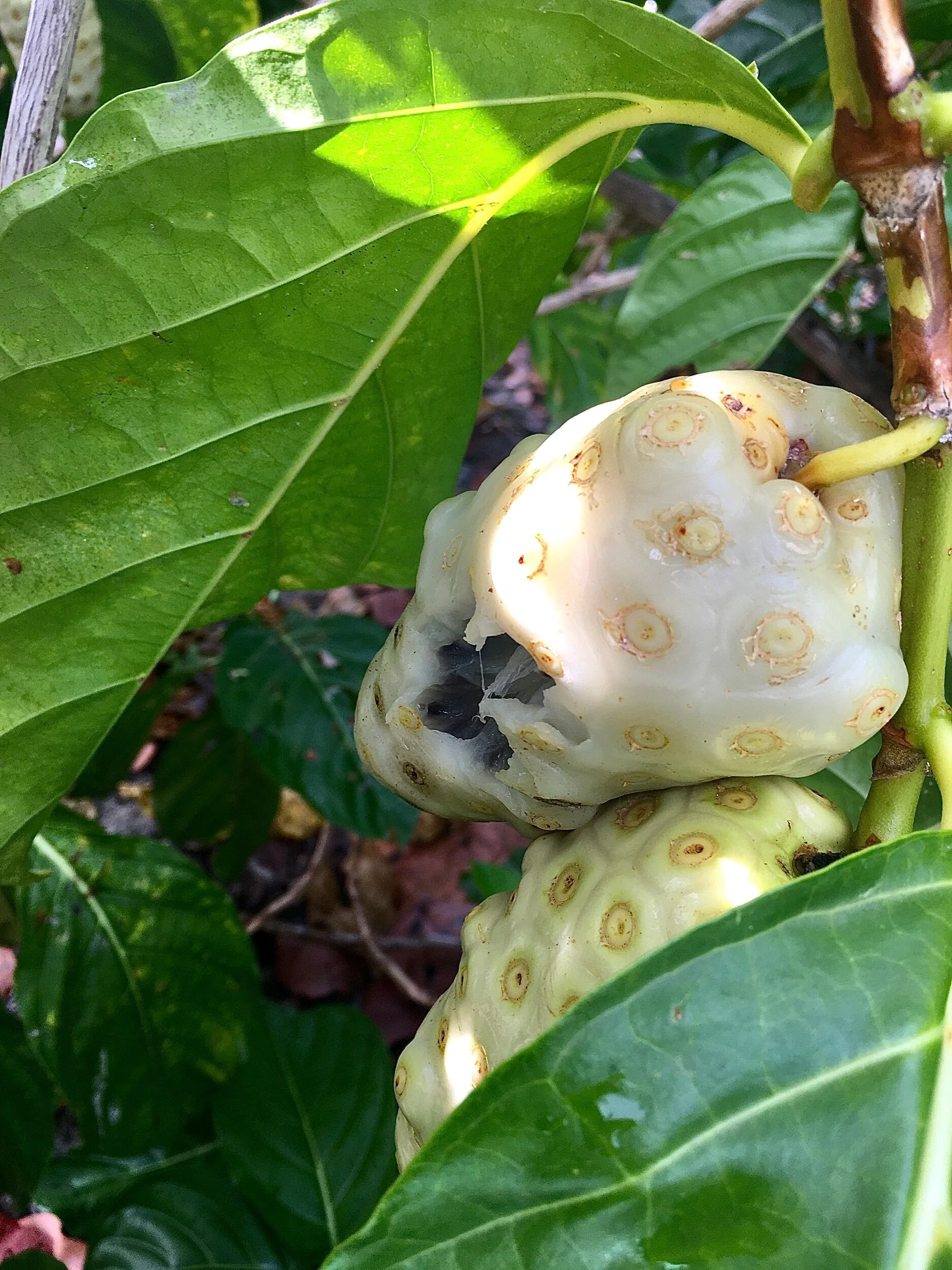 Whether or not this fruit is suitable for our own palates, it's important to note that the noni tree plays an important role in our environment. It is a very tough plant that persists through floods and dry spells. The fruit is a great source of food for birds, insects, bats, and other small animals on the island. The flowers are loaded with nectar that attracts honey bees and butterflies, and the decaying fruits are often breeding grounds for fruit flies.